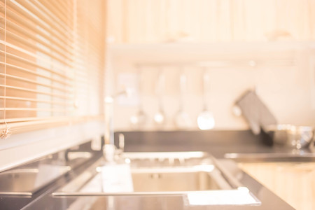Blur image of kitchen room with furniture at home with sunlight for background usage. blur interior concept.