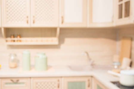 Blurred abstract background. Modern pastel kitchen interior for background.