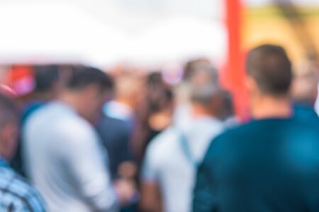 Defocused crowd attending political meeting, large group of of unrecognizable people as audience to politician's speech outdoors