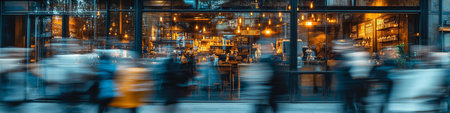 Bustling Storefront, Coffee Shop Window with Motion Blur of Passersby, Hints of Green Plants