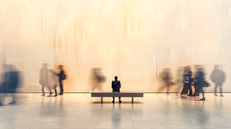 Passengers move through a spacious train station, surrounded by a translucent space background as they await their trains on a bright morning, blending into the atmosphere. Generative AI.