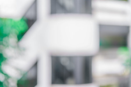 Defocused abstract background of some plants with a white building close to it. Blurred out building area background
