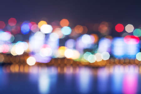 Blurred night city lights. Defocused photo of street lighting with colorful bokeh, light white, red, blue and orange.