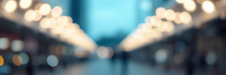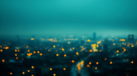 A blurred city street at night, illuminated by warm, glowing bokeh lights from festive decorations and street lamps,...