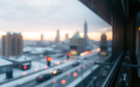 Urban winter view at dusk from a window overlooking a busy street with cars and skyline