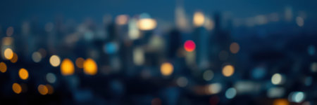 City skyline at dusk with blurred lights and tall buildings in an urban landscape
