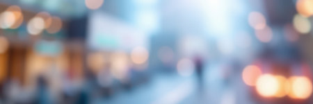 A modern business center with tall skyscrapers is a background of blurred buildings, creating an atmosphere of a dynamic urban rhythm.