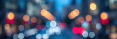 Evening city street illuminated by soft lights and vibrant bokeh effects on a calm night