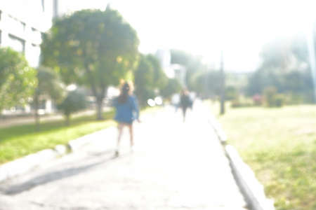 couples walking along sunny urban recreational zone. defocused