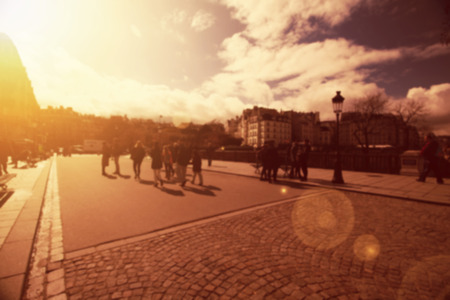 People walking down the street in the evening, beautiful light at sunset. The photo is purposely made out of focus, no faces are recognisible