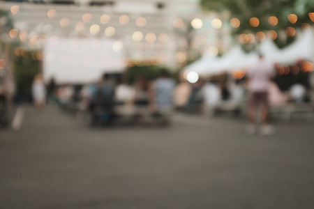 Blurred image of crowded outdoor street festival. Lamps and people background.