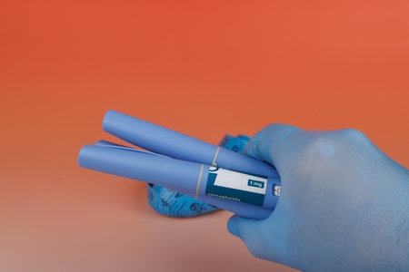 A horizontal view of a hand with semaglutide pens against red gradient, symbolizing diabetes and obesity therapy
