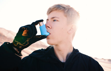 Nature, man and an inhaler for asthma during exercise for a breathing emergency or medical help. Desert, biker and a racer or person with support for lungs after a race or outdoor competition