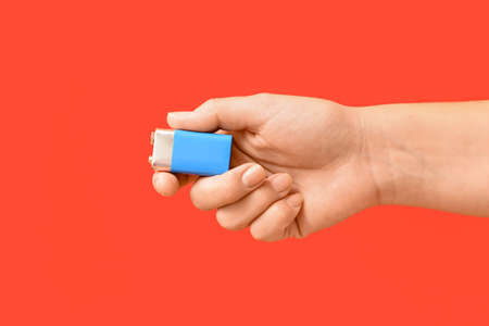 Asthma inhaler, generic, non-branded, held in hand by male hand. Close up studio shot, isolated on white background.