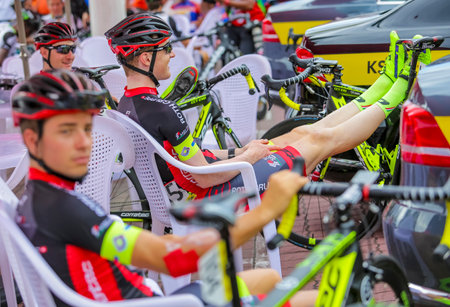 PERAK, MALAYSIA - FEBRUARY 27, 2016: Riders take a rest before compete during Le Tour de Langkawi (LTDL) 2016. LTDL is a multiple-stage bicycle race held in Malaysia.