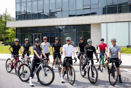 Group of cyclists riding their bicycles on a city street, enjoying a sunny day. Ai generated image