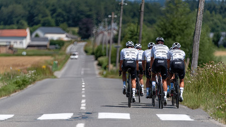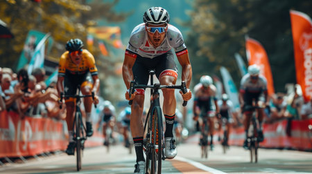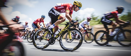 Professional cyclists competing in road race on sunny day, capturing excitement and energy