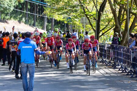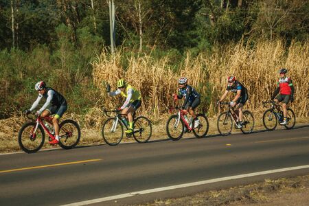 Group of Asian cyclists, they cycle through rural and forest roads.