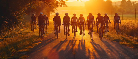 A group of cyclists pedal on a rural road, enjoying the golden hour of sunset surrounded by nature.