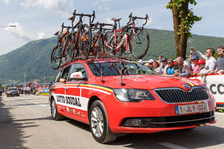 Col du Tourmalet, France - July 24,2014 Three cyclists from Lotto Belisol Team Tony Gallopin, Adam Hansen, Jurgen Van den Broeck lead a part of the peloton on the climbing road to Col de Tourmalet in the stage 18 of Le Tour de France 2014