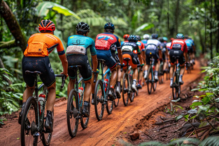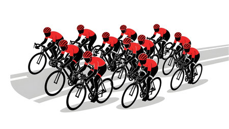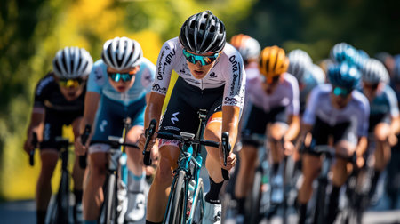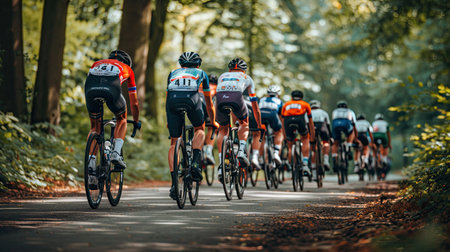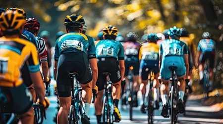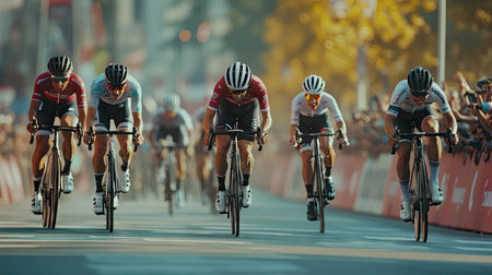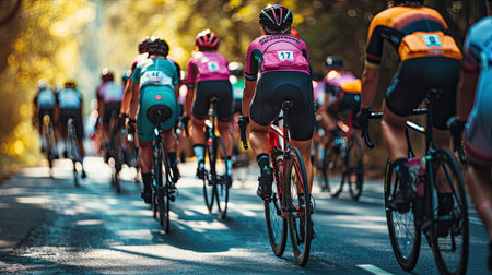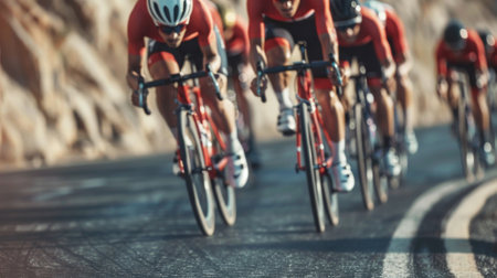 A group of cyclists are racing down a road. Concept of competition and excitement as the riders pedal their bikes