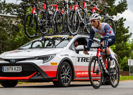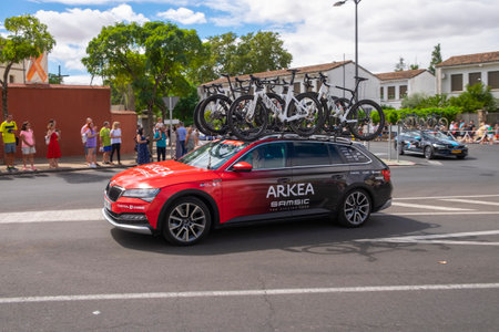 Plasencia, Caceres, Spain - September 08, 2022: Assistance vehicles of the cyclists of the different teams carrying many bicycles on the roof during the cycling tour of Spain. Arkea Samsic.