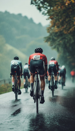 Cyclists compete in a bicycle road race on rainy country roads, captured from behind