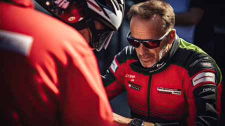 Cyclist and teammate synchronized hand-off in relay race bright track colors teamwork