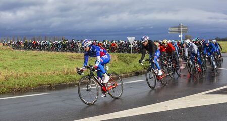 Cernay-la-Ville, France - March 5, 2017: The peloton taking a curve on a wet road during the first stage of Paris-Nice on 5 March, 2017.