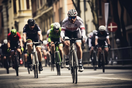 Group of cyclists in a race on city streets. Competitive spirit and urban cycling.