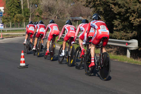 Imperia, IM, Liguria, Italy - March 17, 2018: An important cycling race in a small town in Italy in March. The name of the competition is Milano-Sanremo 2018