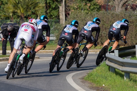 DONORATICO, LIVORNO, ITALY - MARCH 07: Team Katusha during the 1st Team Time Trial stage of 2012 Tirreno-Adriatico on March 07, 2012 in Donoratico, Livorno, Italy