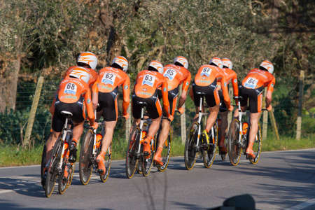 DONORATICO, LIVORNO, ITALY - MARCH 07: Team Euskaltel Euskadi during the 1st Team Time Trial stage of 2012 Tirreno-Adriatico on March 07, 2012 in Donoratico, Livorno, Italy