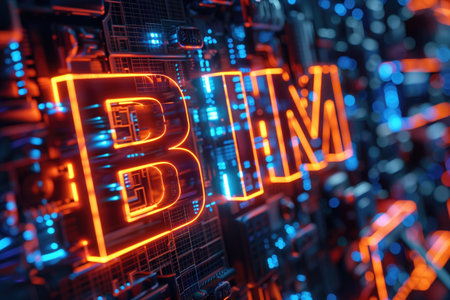 Glowing orange BIM letters on abstract circuit board with blue lights in blurred background. Depicts concepts of technology, Building Information Modeling, and digital infrastructure.