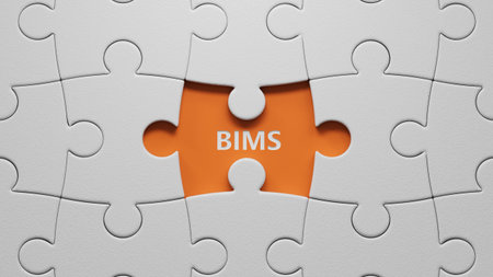 bims word concept. The white puzzle pieces with missing pieces.close up of The white puzzle pieces with missing pieces,Business Concept.3D rendering on orange background.