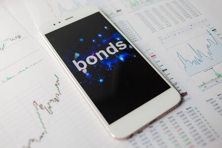 Investment in bonds, conservative investment concept. Reports and statistics, analysis of the corporate securities market. Smartphone with an inscription on the screen