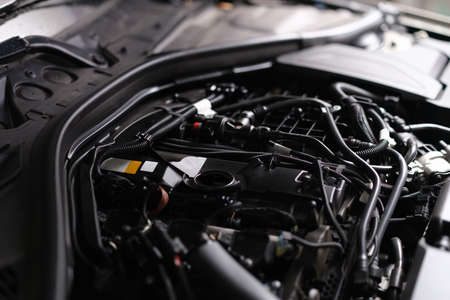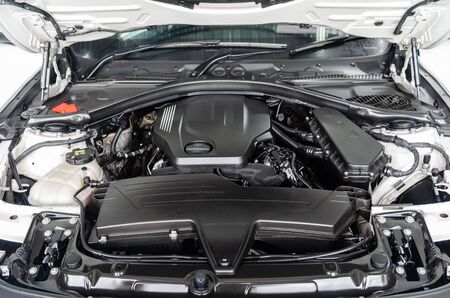 View under Car Hood of Modern turbocharged eco-friendly engine or motor.