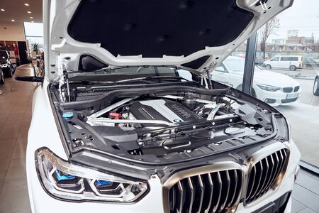 08 of Fabruary, 2018 - Vinnitsa, Ukraine. New BMW X5 car presentation in showroom - under the hood