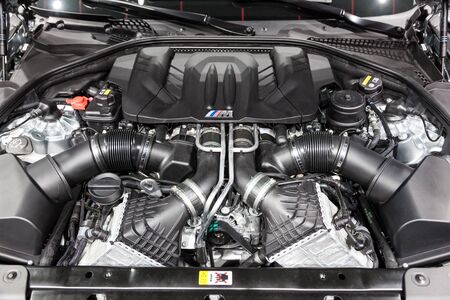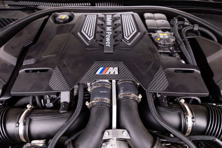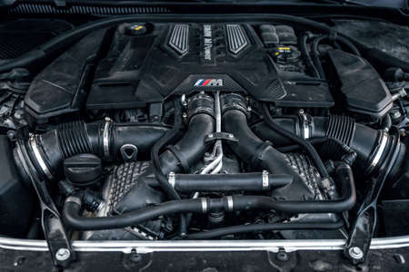 Ukraine, Odessa - July 8, 2021: BMW M5, close-up of the engine of the modern car, front view. Internal combustion engine, car parts, deteyling.