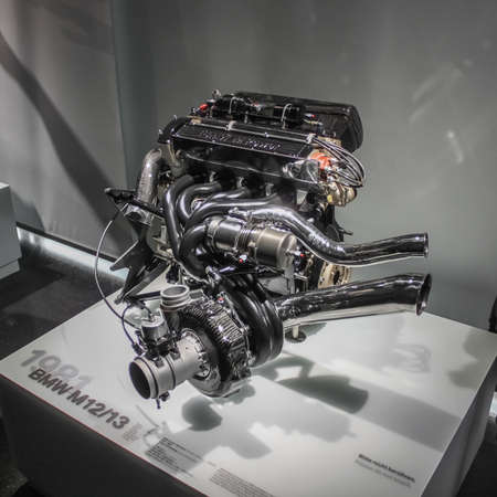 Germany, Munich - April 27, 2011: BMW M12 / 13 engine for Formula 1 racing in the exhibition hall of the BMW Museum. The motor was developed in 1981
