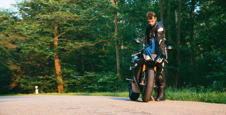 motorbike on the forest road riding. having fun driving the empty road on a motorcycle tour journey. copyspace for your individual text.