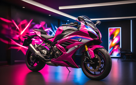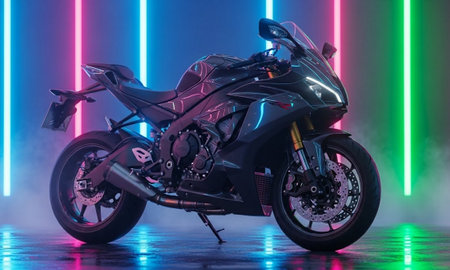 A stunning black motorcycle showcased in a neon-lit studio with vibrant colorful lights, evoking a sense of speed and innovation, perfect for advertising, marketing, or editorial use