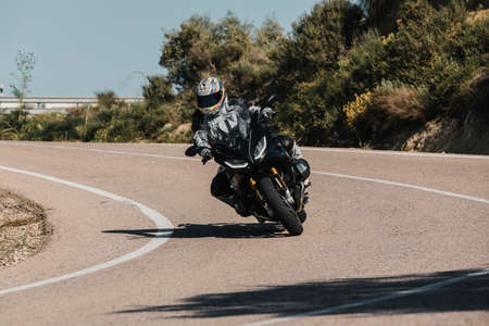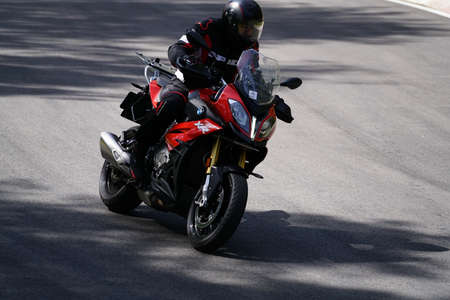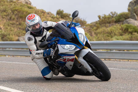 Almeria, Spain - May 5th 2021: Man riding a BMW R 1250 RS motorcycle in a mountain road, during Dunlop Xperience event in Andalusia, Spain.