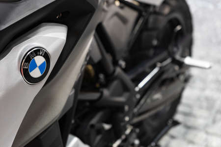 MOSCOW, RUSSIA - NOVEMBER 10, 2020. BMW emblem on the motorbike, close-up shot