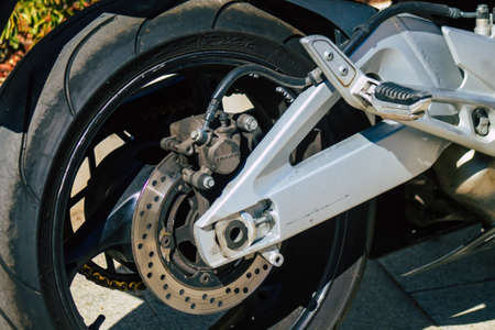 Closeup aluminum alloy wheel of motorcycle parked at car parking lot. Steel rims. Mag wheels of motorbike. Performance wheel and tire of motorcycle. Chrome disc brake and abs. motorbike accessory.