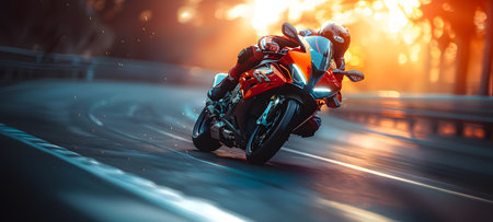 Dynamic motorcycle racing down the road with striking speed blur effect in red and black colors
