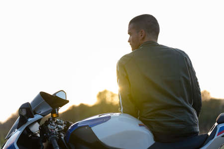 Motorcyclist riding a motorcycle on a country road at sunset. ai generative.