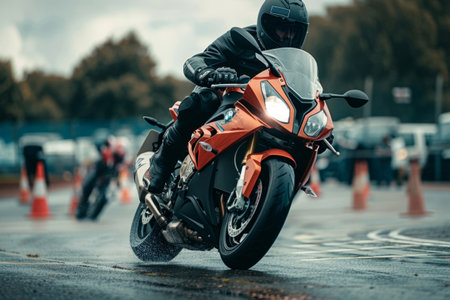 man riding motorcycle in asphalt road. Motorcyclist in black suit at red sport motorcycle.