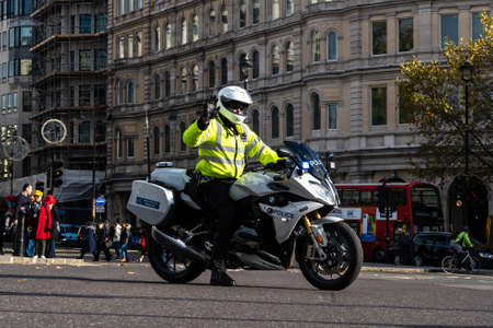 LONDON, UNITED KINGDOM - Nov 11, 2019: British police officer on motor bike stops car traffic at busy trafalgar square intersection for government escort. London traffic needs to stop