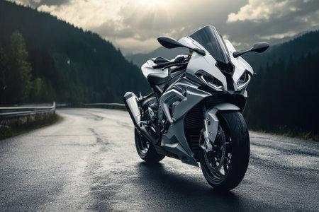 A modern motorcycle stands parked on a winding road as clouds loom overhead, reflecting afternoon light.